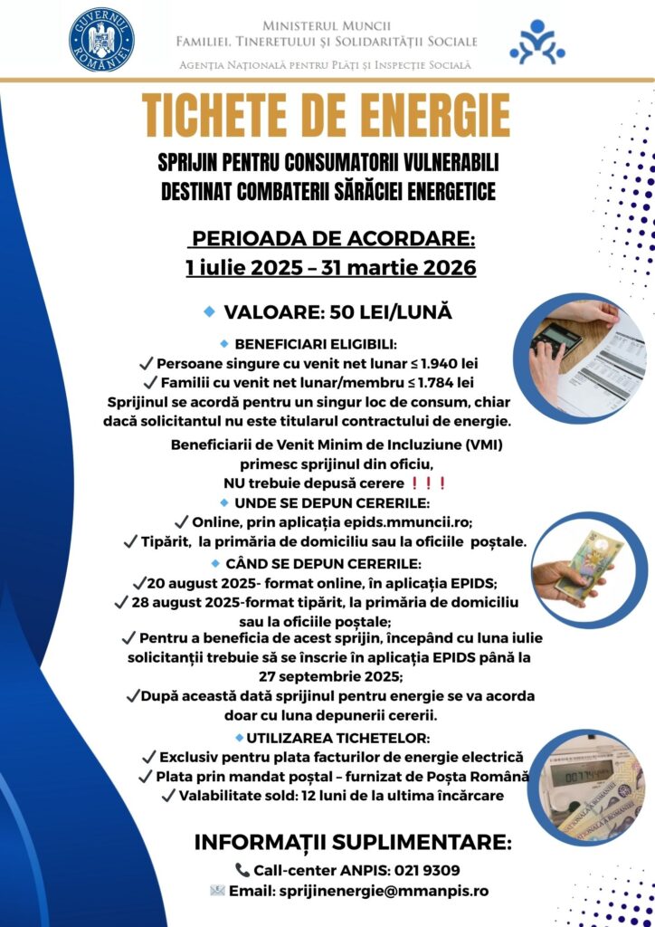 Informații suplimentare pot fi obținute la call-center-ul Agenției Naționale pentru Plăți și Inspecție Socială, 021.9309, sau la Direcția de Asistență Socială Sibiu, la numerele 0269.208.932 și 0739.016.037.