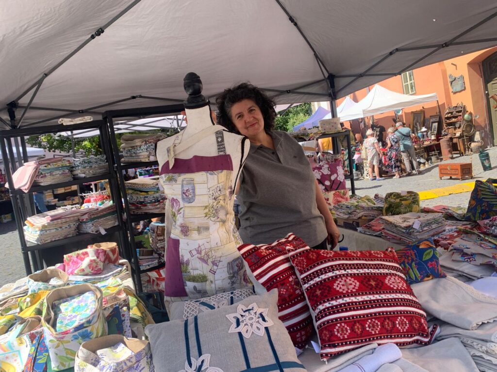 În altă zonă, am găsit-o pe Dana Uțiu din Cluj, care a adus astăzi la târg o mulțime de produse pentru casă: fețe de masă, fețe de pernă, plase tip geantă pentru umăr, perne din bumbac. Toate acestea realizate de ea la atelierul său personal. Dana ne-a spus că de peste 15 ani realizează la croitoria sa „DanaAtelier” produse pentru târg, iar de 5 ani vine la Sibiu, pentru că după cum spune ea: „sibienii apreciază produsele handmade”.