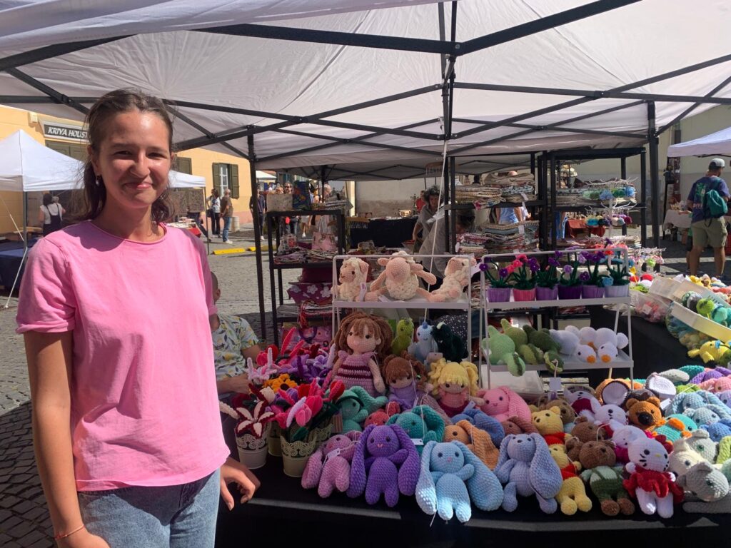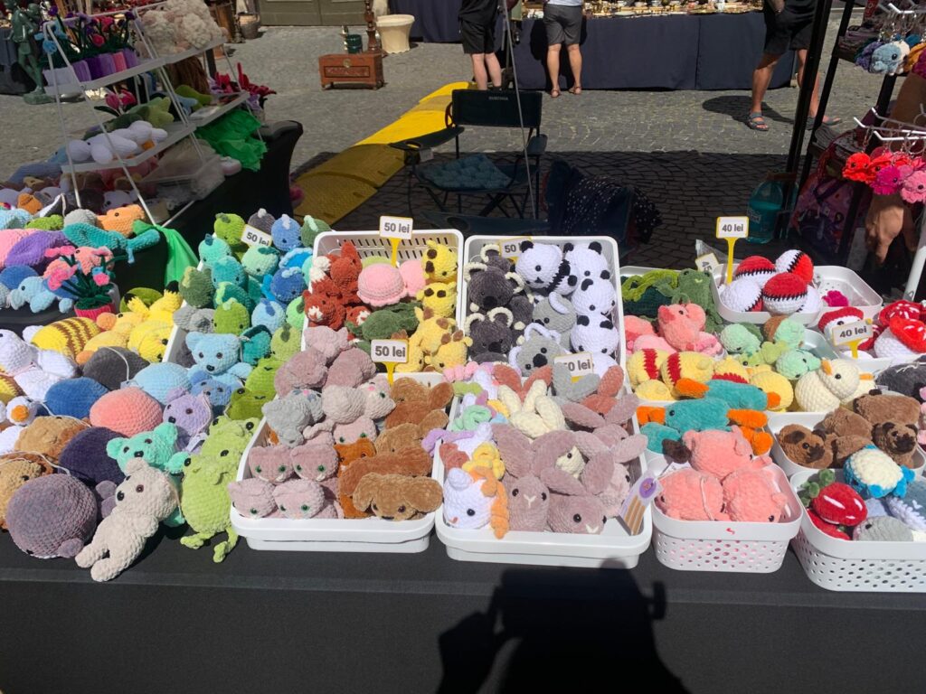 La acest stand am întâlnit-o pe Denisa Bologa din Timișoara, creatoarea brandului „Momo’s Crochets”. Denisa croșetează încă din adolescență. De la 18 ani a descoperit „tehnica amigurumi” și a început să realizeze jucării croșetate, fiecare lucrată cu migală și pasiune. O jucărie mică durează între patru și cinci ore, în funcție de complexitatea modelului, iar la Sibiu a venit pentru a doua oară. Aceasta ne-a spus că a remarcat prezența numeroasă a turiștilor străini, care din spusele ei sunt mai mulți decât la Timișoara.