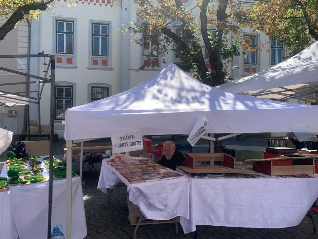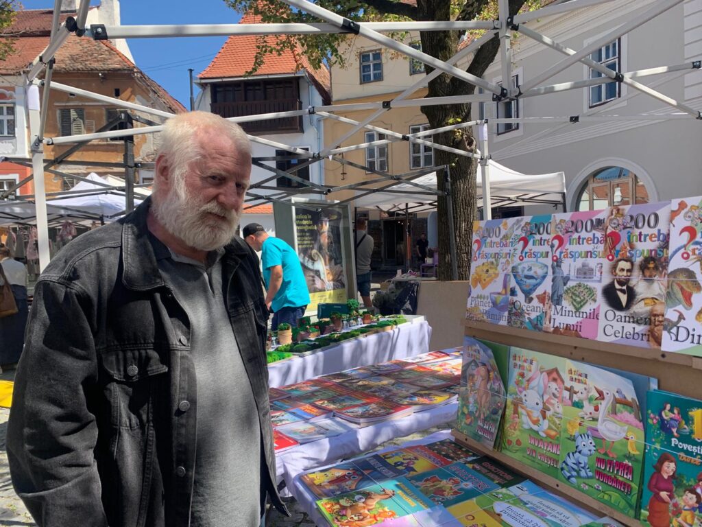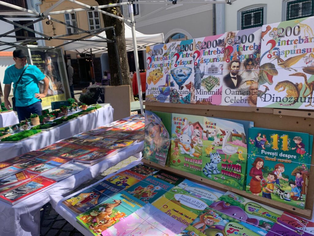 În zona de intrare în piață, am dat de Moldovan Cristian, tehnoredactor la Editura Educațional Gama. Domnul a adus astăzi la Sibiu cărți pentru cei mici: cărți de colorat și cărți de citit. El ne-a menționat că din păcate, prin avansarea tehnologiei, cărțile fizice nu vor mai fi o alegere pentru oameni, dar are speranțe, pentru că cei mici încă sunt atrași de carte. Pentru a motiva cititul, domnul ne-a spus că oferă și o promoție: “la două cărți cumpărate primiți una gratis sau un balon”. O campanie simpatică, oferită de un domn la fel de simpatic.