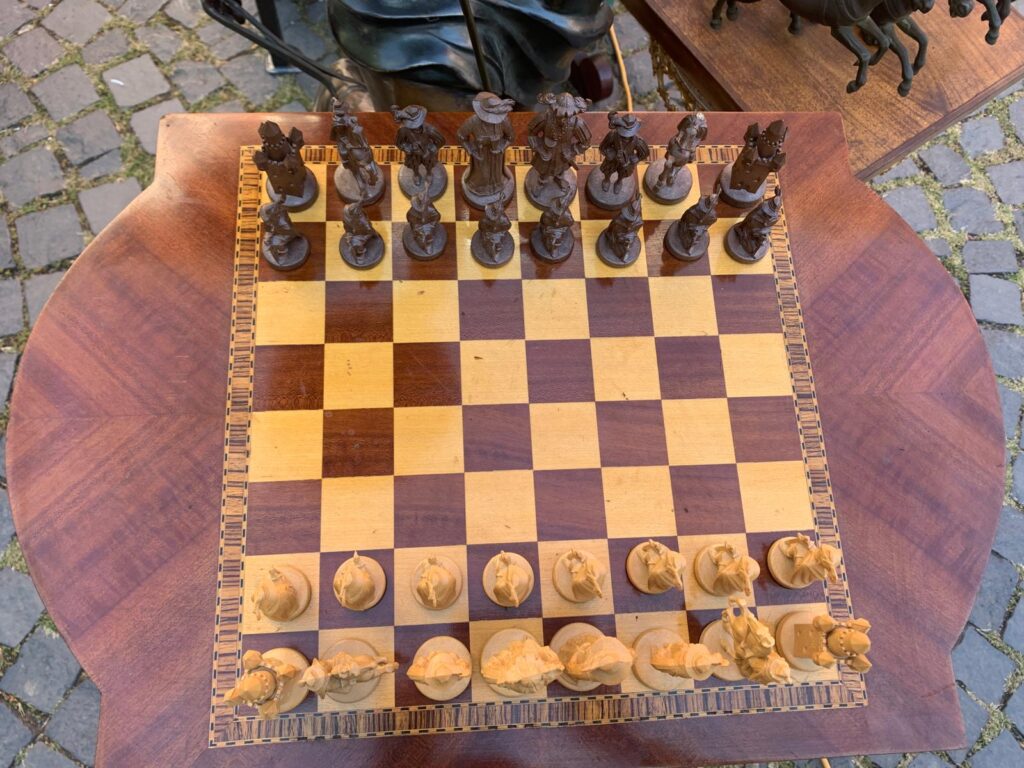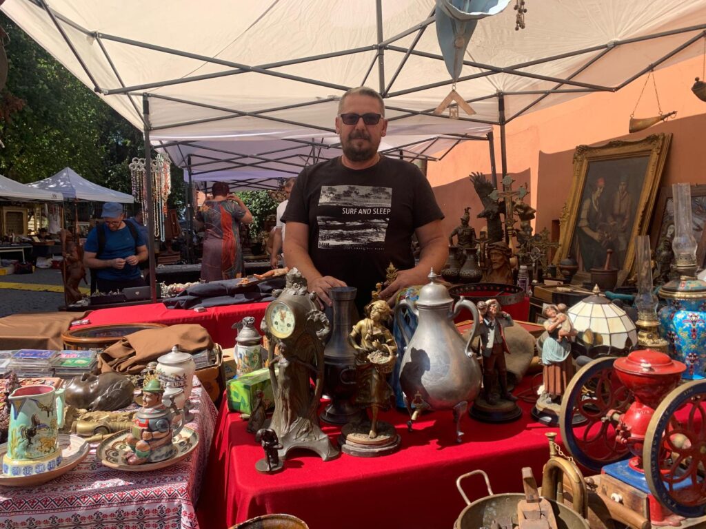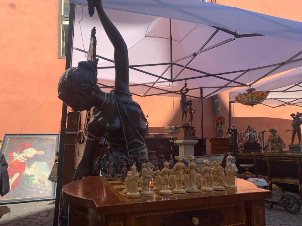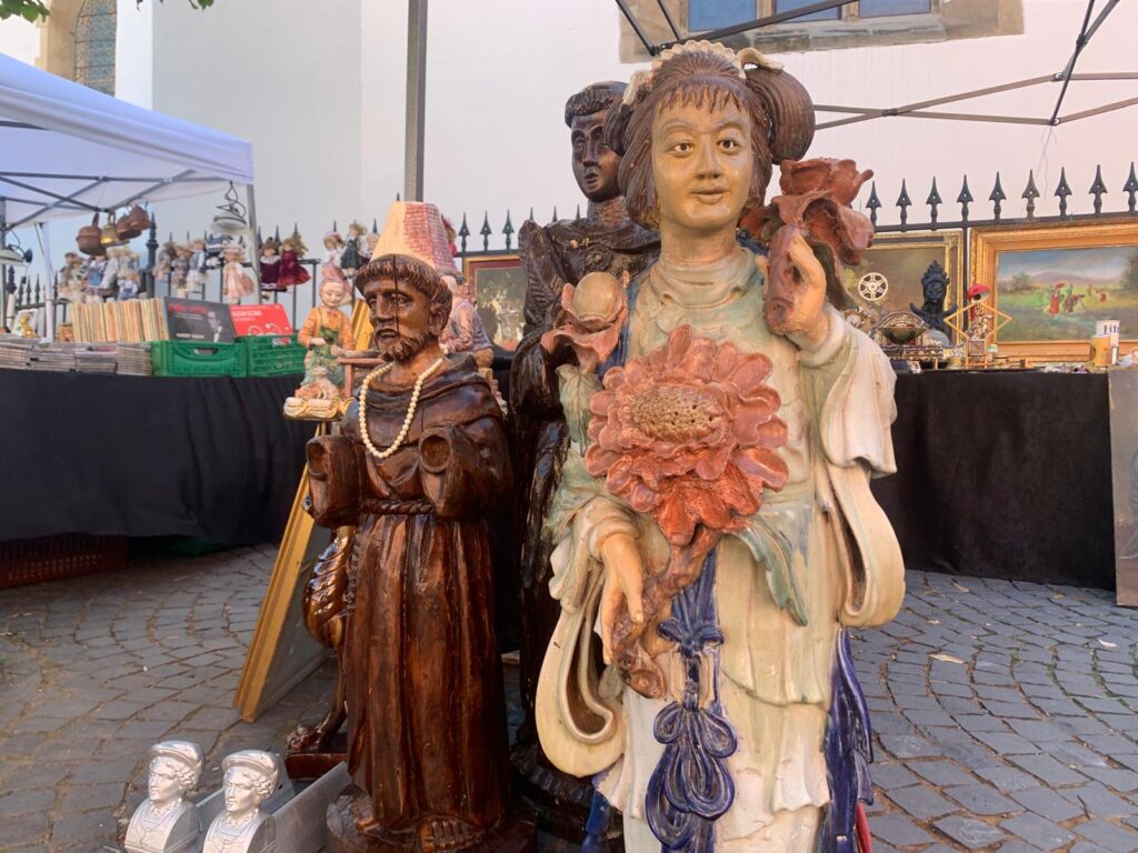 La un stand din capătul pieței, am dat de obiecte de colecție cu o vechime impresionantă. Am putut admira sculpturi, farfurii și piese „vechi de până la 300 de ani”, cum spune chiar expozantul. Toate achiziționate de el, în special din Italia. Printre exponatele valoroase pe care domnul le prezenta, am găsit o icoană despre care ne-a spus că este o icoană religioasă catolică, pictată pe pânză și după lipită pe lemn, realizată de un pictor a cărui semnătură a n-a rămas peste ani. Dar totuși, pictura a atras publicul prin frumusețea și expresivitatea cu care este pictată.