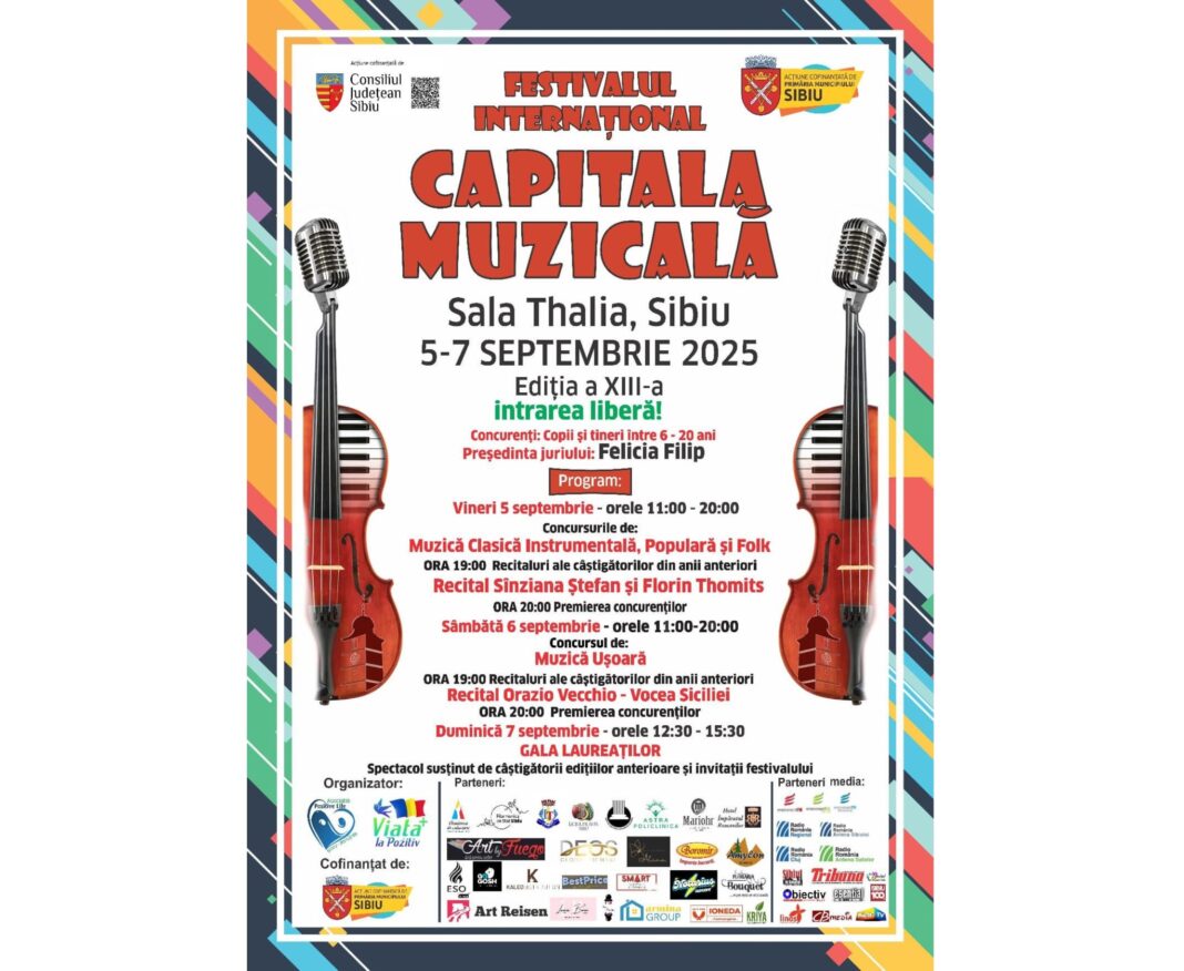 Peste 220 de copii și tineri talentați din România, Republica Moldova, Italia și Bulgaria participă în acest weekend la ediția a XIII-a a Festivalului Internațional „Capitala Muzicală”, care se desfășoară în perioada 5-7 septembrie la Sala Thalia, Sibiu. Evenimentul este organizat de Asociația Positive Life, în parteneriat cu Liceul Tehnologic „Independența” Sibiu și Liceul de Artă Sibiu și cofinanțat de Primăria Sibiu prin Agenda Culturală 2025. Festivalul se desfășoară cu sprijinul Consiliului Județean Sibiu. Accesul publicului este liber, în limita locurilor disponibile.