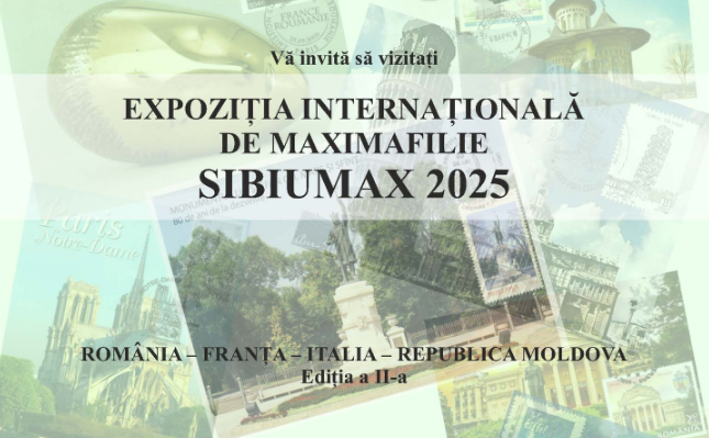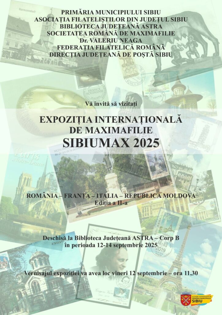 Asociația Filateliștilor din județul Sibiu organizează în perioada 12-14 septembrie expoziția internațională de maximafilie SIBIUMAX 2025, găzduită de Biblioteca Județeană ASTRA -Corp B. Proiectul este cofinanțat de Primăria Sibiu prin Agenda Culturală 2025.
