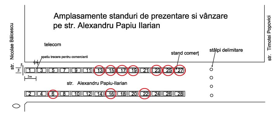 - 10 standuri de 4 mp fiecare, situate pe str. Al. Papiu Ilarian, destinate comercializării produselor hand made, articolelor de artizanat, produse de anticariat (cărți), tablouri și vederi de dimensiuni reduse. Prețul minim al chiriei va fi de 1.460 lei / an / stand. Contractele de închiriere se vor încheia pe o perioadă de 2 ani.