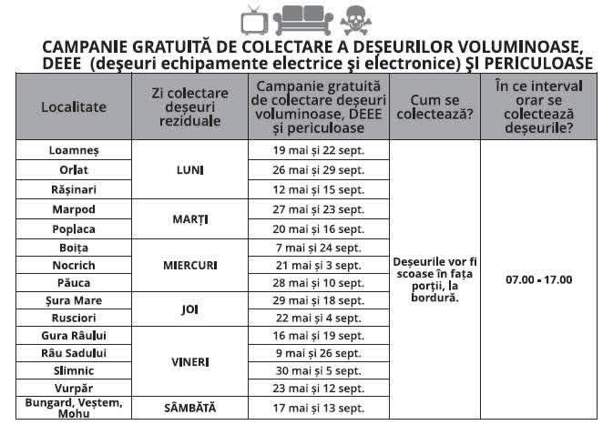 Primăria Comunei Boița informează locuitorii că mâine va avea loc o acțiune de colectare a deșeurilor voluminoase, a echipamentelor electrice și electronice uzate (DEEE), precum și a deșeurilor periculoase.