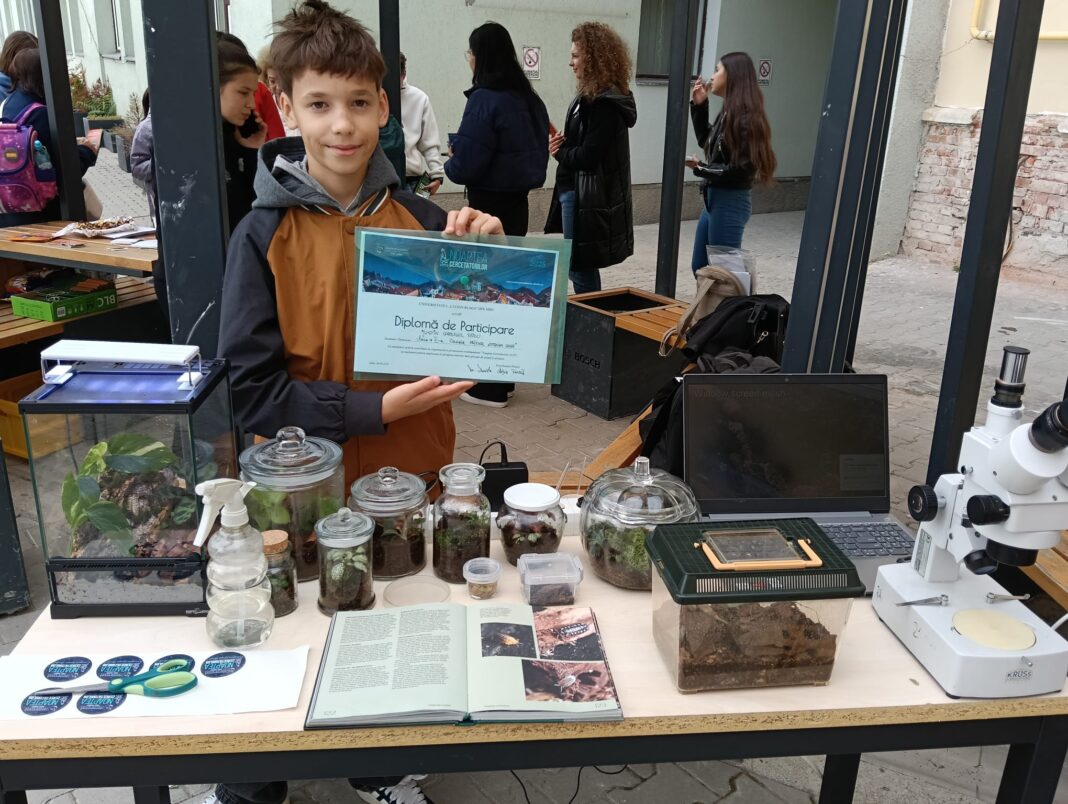 Anul acesta, Justin a participat la Noaptea Cercetătorilor, unde a fost cel mai tânăr expozant. A prezentat publicului terarii bioactive confecționate de el, explicând cum funcționează ecosistemele miniaturale, rolul plantelor și al insectelor și activitățile practice la microscop.
