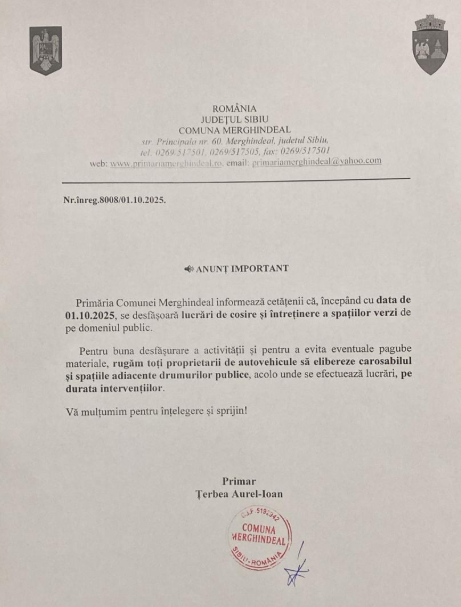 Primăria Comunei Merghindeal, județul Sibiu, informează cetățenii că, începând cu data de astăzi, se vor desfășura lucrări de cosire și întreținere a spațiilor verzi de pe domeniul public.