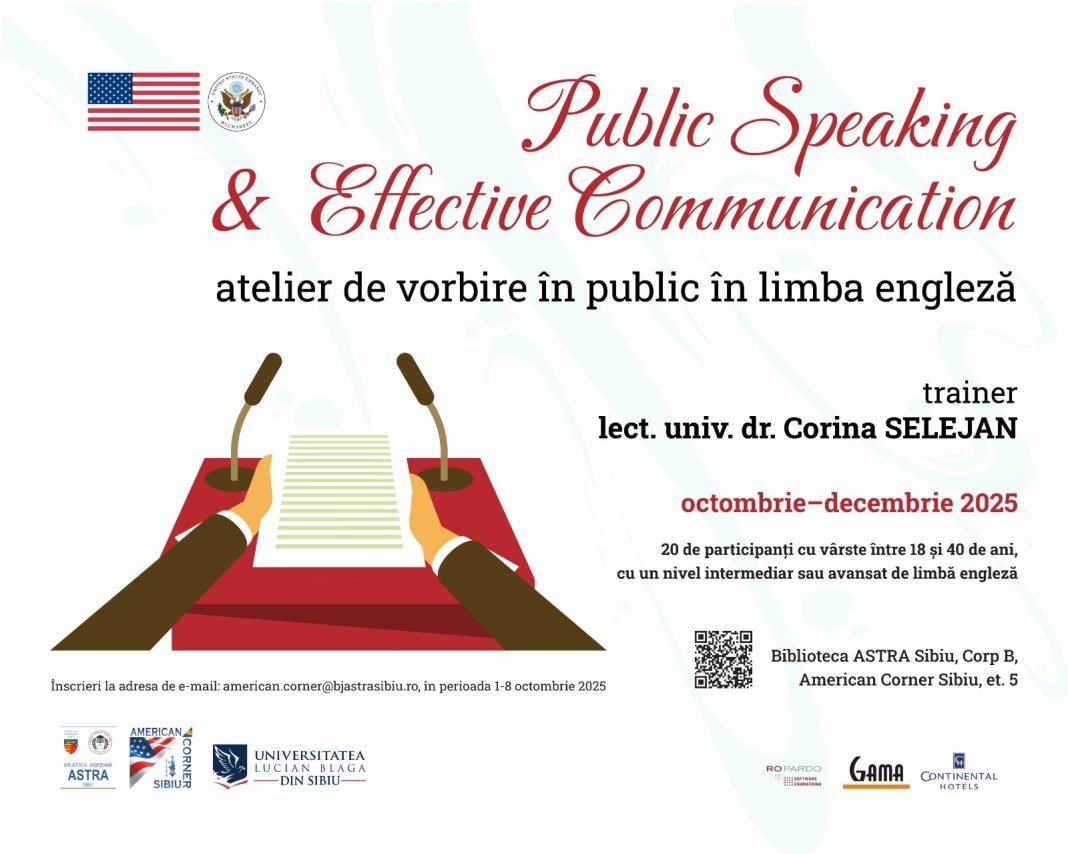 Biblioteca Județeană ASTRA Sibiu, împreună cu American Corner Sibiu și Universitatea „Lucian Blaga” din Sibiu, cu sprijinul Ambasadei Statelor Unite ale Americii în România, organizează atelierul educațional „Public Speaking & Effective Communication”, dedicat dezvoltării abilităților de comunicare în limba engleză și formării competențelor esențiale de vorbire în public.
