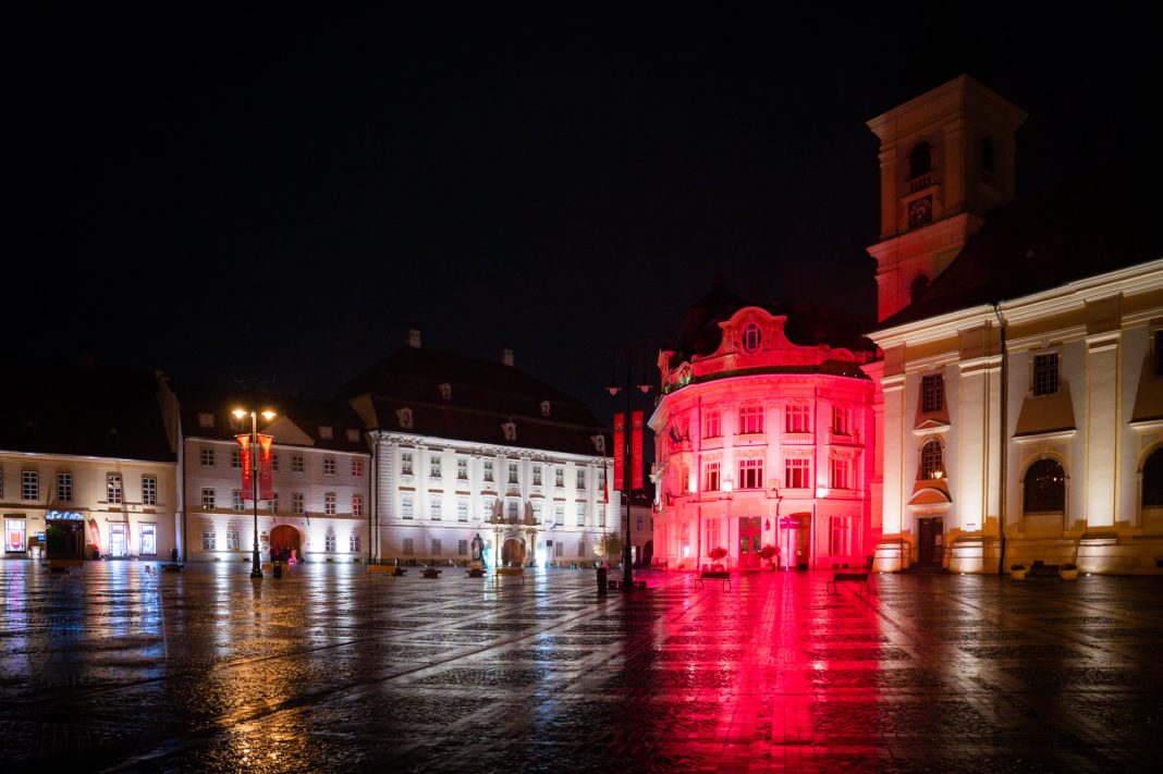 Clădirea Primăriei din Piața Mare este iluminată în roz în această seară, cu ocazia Zilei Naționale de Luptă împotriva Cancerului de Sân, marcată în România pentru al 25-lea an consecutiv.