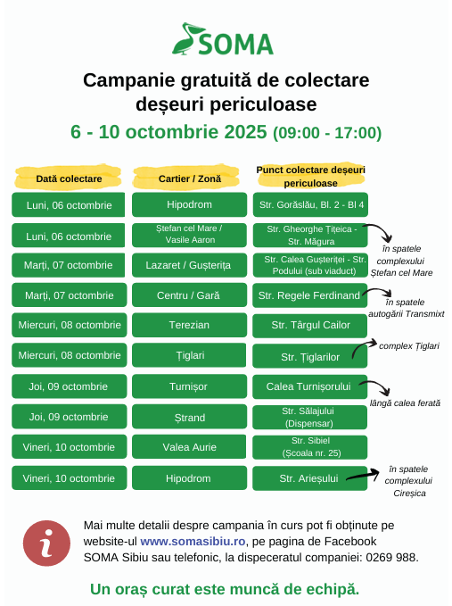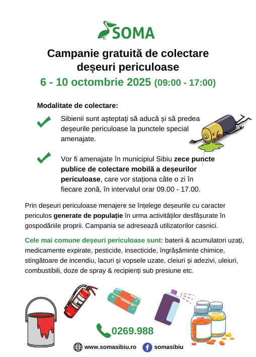 Operatorul de salubritate SC Soma SRL va organiza, în perioada 6-10 octombrie, a doua campanie din acest an de colectare a deșeurilor periculoase. Acțiunea se adresează exclusiv persoanelor fizice din municipiul Sibiu și presupune colectarea gratuită a acestor tipuri de deșeuri prin intermediul unor puncte mobile.