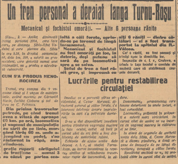 În zorii unei zile de toamnă, în septembrie 1935, liniștea Văii Oltului a fost sfâșiată de vuietul unui tren care aluneca necontrolat spre prăpastie. Trenul personal nr. 2004, pe ruta Sibiu–Râu Vadului, cobora încet, printre stânci și păduri ude de rouă, când, la o cotitură strânsă lângă Turnu Roșu, șinele au cedat.