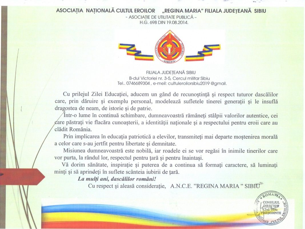 Cu ocazia Zilei Educației care a avut loc ieri, Asociația Națională Cultul Eroilor „Regina Maria” Filiala Județeană Sibiu a transmis un mesaj de recunoștință și respect pentru cadrele didactice, subliniind importanța lor în formarea tinerei generații și în cultivarea dragostei de neam și de patrie.