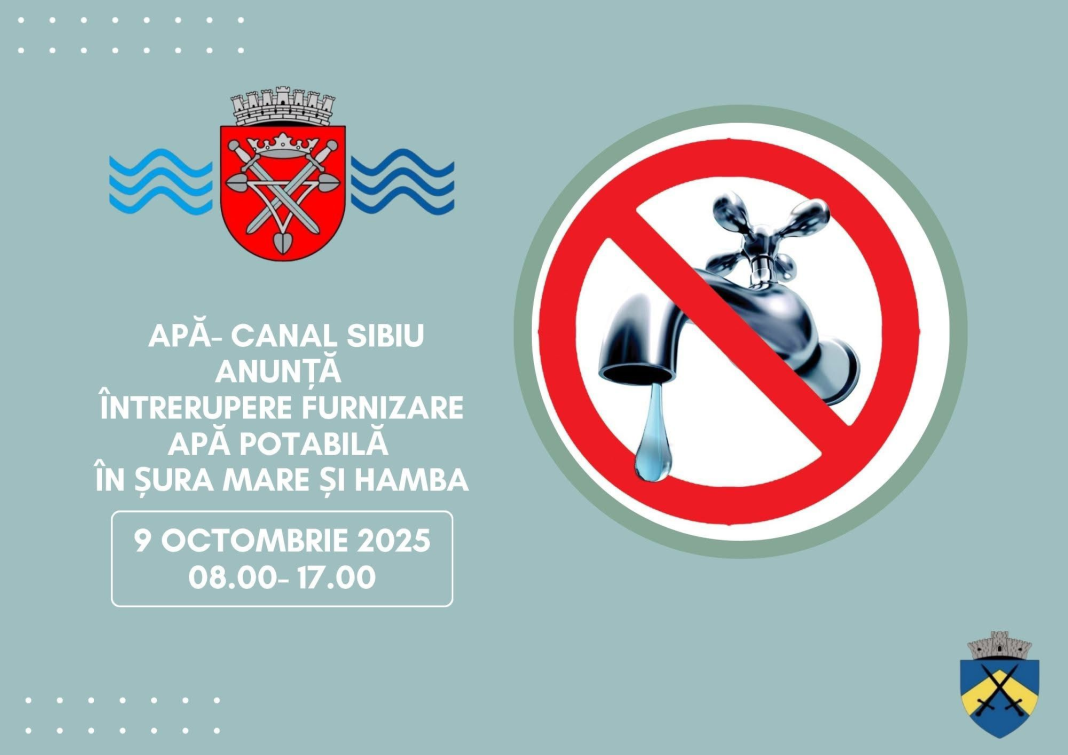 Potrivit Primăriei comunei Șura Mare, Compania APĂ CANAL Sibiu va întrerupe furnizarea apei potabile în Șura Mare și Hamba.