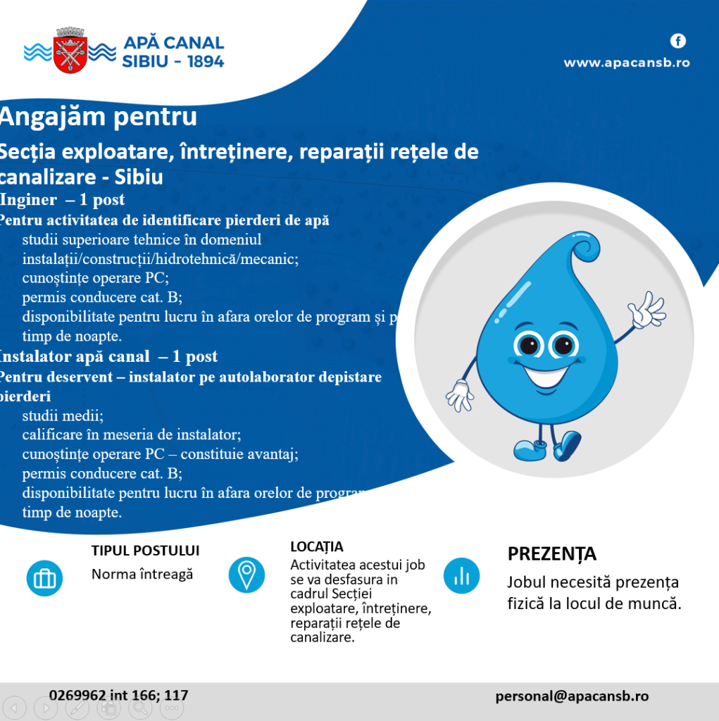 Apă Canal Sibiu S.A. recrutează un inginer și un instalator apă canal pentru Secția exploatare, întreținere, reparații rețele de canalizare.