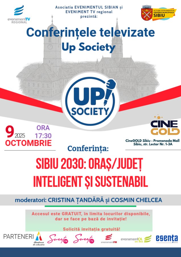 Asociația Evenimentul Sibian și Eveniment TV Regional organizează a șaptea și totodată ultima conferință televizată din cadrul proiectului „UP Society”, co-finanțat de Primăria Municipiului Sibiu. Ultima conferință cu tema „Sibiu 2030: Oraș/Județ inteligent și sustenabil”, va avea loc mâine de la ora 17:30 la CineGOLD Sibiu din Promenada Mall.