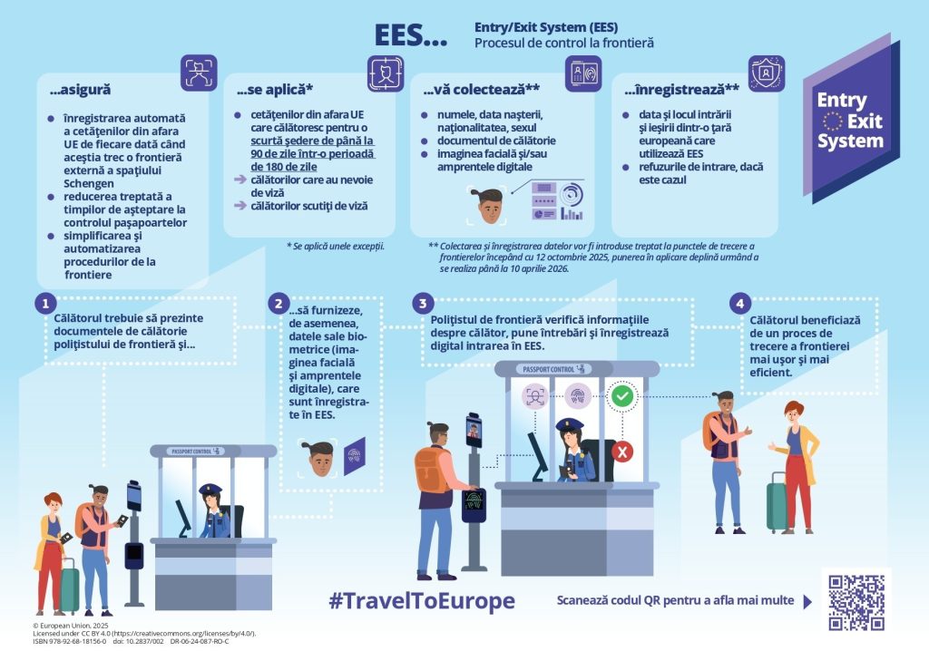 Sistemul EES, care devine operațional la nivelul tuturor statelor membre UE începând cu 12 octombrie, va fi implementat în România etapizat, urmând să fie extins treptat și la celelalte puncte de trecere a frontierei în următoarele maximum 170 de zile.