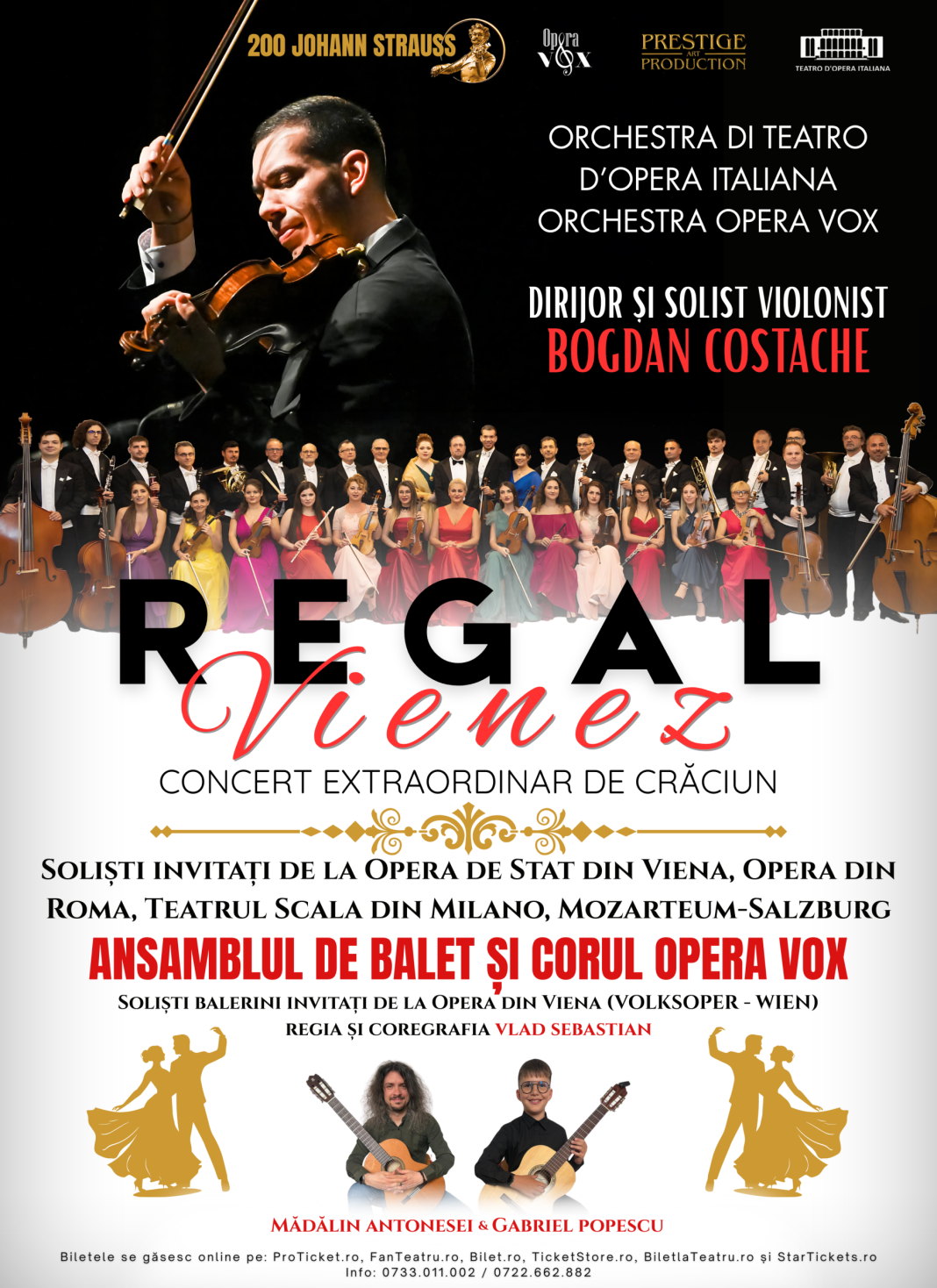 ”Ne asumăm misiunea în fiecare an de a aduce în fața dumneavoastră și de a promova tineri muzicieni români deosebit de talentați, la început de carieră, dar care au câștigat deja premii la concursuri muzicale naționale și internaționale. Anul acesta va evolua alături de orchestra noastră foarte tânărul chitarist Gabriel Popescu, alături de profesorul și îndrumătorul lui Mădălin Antonesei. Atmosfera și spiritul vienez vă vor cuceri încă de la intrarea în sala de spectacol și vă vor rămâne în suflet ca o amintire vie pentru Crăciunul și Anul Nou ce vor urma. Dacă nu puteți ajunge la concertele de Crăciun și Anul Nou de la Viena, aducem noi spiritul vienez în orașul dumneavoastră prin cele mai frumoase capodopere muzicale vieneze ale dinastiei Strauss, Franz Lehar, Emmerich Kalman și multe, multe alte surprize muzicale și coregrafice. În fiecare an vă surprindem cu un nou repertoriu, noi invitați speciali și coregrafii spectaculoase, astfel încât fiecare REGAL VIENEZ să rămână unul memorabil!”, au mai transmis organizatorii Regalului Vienez.