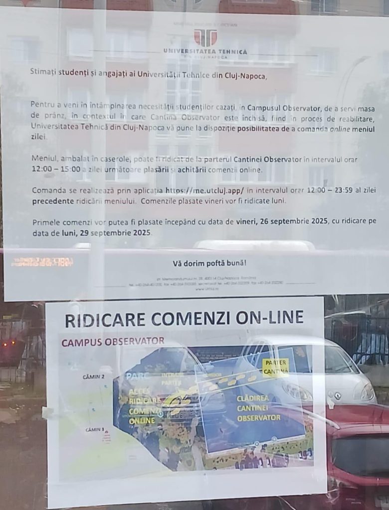 Universitatea Tehnică din Cluj-Napoca a implementat o soluție temporară modernă pentru perioada în care Cantina Observator este în renovare. Astfel, studenții pot comanda online meniul zilei prin aplicație, iar meniurile pot fi ridicate a doua zi, între orele 12:00 -15:00, de la parterul cantinei, unde este și pregătită mâncarea. Această inițiativă asigură continuitatea serviciului de masă și demonstrează o adaptare rapidă la cerințele actuale ale vieții studențești, oferind acces facil la mese calde și variate, chiar și în perioada lucrărilor.