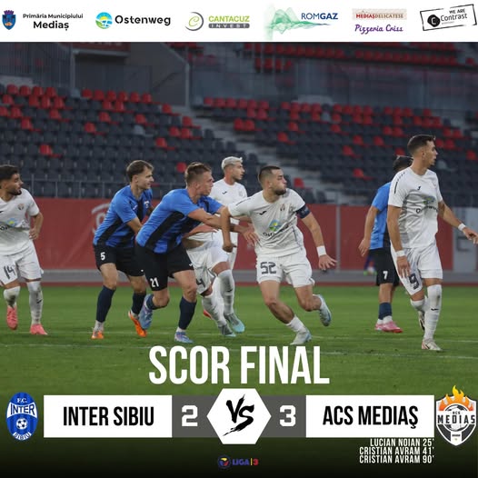 ACS Mediaș a obținut o victorie importantă în etapa a 9-a a Ligii a III-a, învingând cu scorul de 3-2 formația Inter Sibiu, într-un meci disputat pe stadionul Municipal din Sibiu. Partida a fost marcată de răsturnări spectaculoase de scor și un final dramatic.