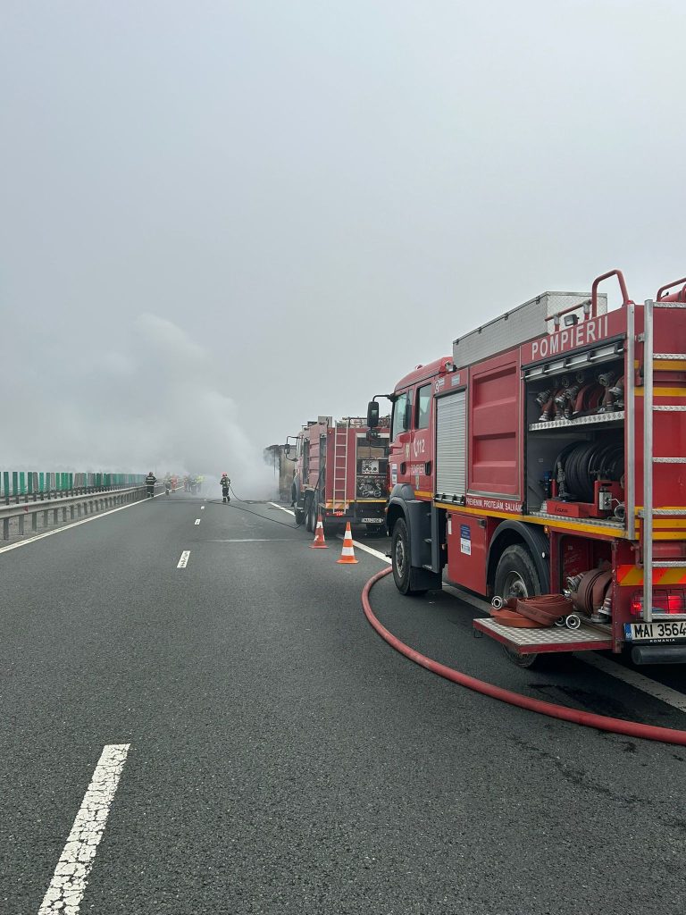 Un autocamion a fost cuprins de flăcări, iar incendiul s-a manifestat violent, cu degajări mari de fum. ISU Sibiu a intervenit de urgență în apropiere de ieșirea spre aeroport, pe sensul Sebeș – Sibiu, cu două autospeciale de stingere și un echipaj SMURD.