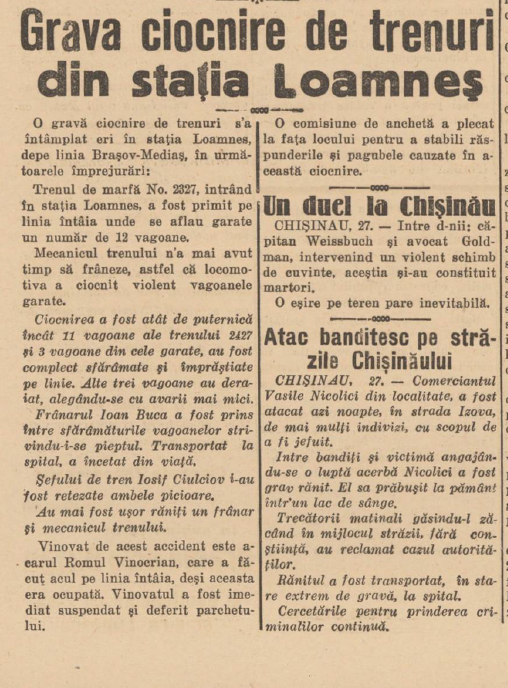 Ziarul Dimineața scria sec, dar dureros: „Șefului de tren Culciav Iosif i s’a fracturat ambele picioare, iar frânarului Boca Ion i s’a strivit pieptul” — o relatare rece, dintr-o epocă în care moartea pe linia ferată era un risc al meseriei, nu o tragedie publică. Alte ziare relatează că au mai fost răniți alt frânar și un mecanic de tren.