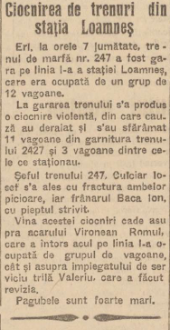Mecanicul n-a mai avut timp să frâneze. „Locomotiva a ciocnit violent vagoanele garate”, nota Cuvântul. Într-o fracțiune de secundă, 14 vagoane s-au transformat în mormane de fier sfărâmat. 11 vagoane deraiate din trenul de marfă sosit în stație și alte 3 din cele garate au rupt șinele și au distrus și o parte din peron.