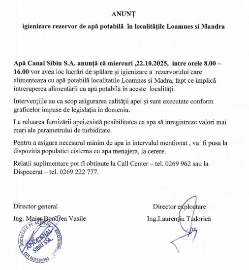 Apă Canal Sibiu S.A. anunță că miercuri 22.10.2025, intre orele 8.00 -16.00 vor avea loc lucrări de spălare și igienizare a rezervorului care alimenteaza cu apă potabilă localitatile Loamneș și Mândra, fapt ce implică întreruperea alimentării cu apă potabilă în aceste localități.