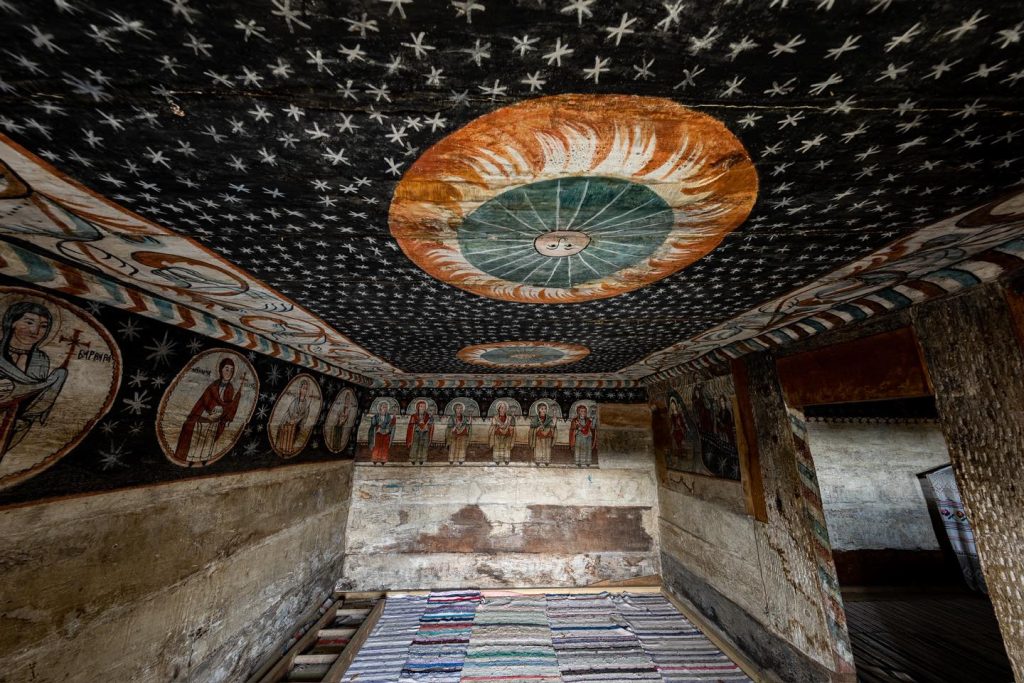 Oriunde ai sta, ochii de sfinți te urmăresc din înaltul bolții sau de pe pereți. Parcă sunt într-o neîntreruptă veghere asupra celor care de mai bine de 350 de ani caută liniște și speranță în mica biserică. „Țăranii nu știau carte și tocmai de aceea scenele biblice au un pronunțat caracter descriptiv. Vedem scene cu Facerea femeii din coasta lui Adam, apoi păcatul primordial, urmat de izgonirea lui Adam și a Evei din Rai. Așa, oamenii înțelegeau mai ușor Biblia.”