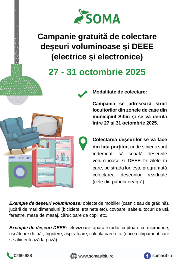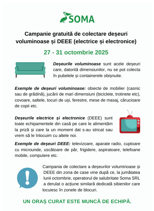 Operatorul de salubritate Soma SRL va organiza, între 27 și 31 octombrie, o nouă campanie de colectare a deșeurilor voluminoase și a celor de echipamente electrice și electronice (DEEE) în municipiul Sibiu. Acțiunea se adresează exclusiv locuitorilor din zonele de case și are ca scop sprijinirea colectării responsabile a deșeurilor de mari dimensiuni.