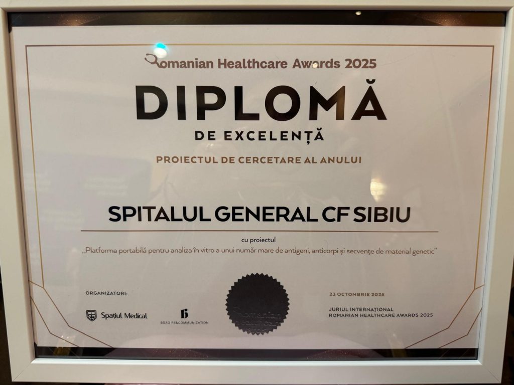 Spitalul General CF Sibiu a fost recunoscut pentru performanțele sale în domeniul medical, obținând Diploma de Excelență în cadrul Galei Romanian Healthcare Awards 2025, la categoria „Proiectul de cercetare al anului”. Instituția a fost reprezentată la eveniment de Daniela Meițescu, care a primit diploma în numele întregii echipe.