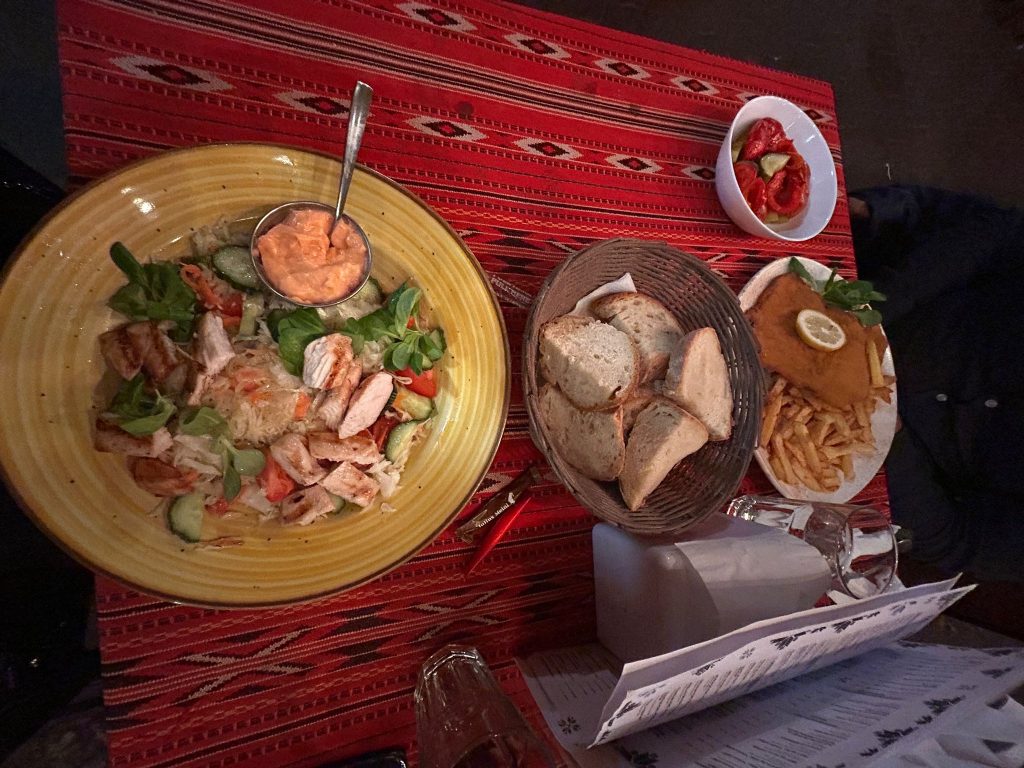Sincer, ne-am săturat doar din ciorbă, dar fiind pentru prima dată acolo, am ales să comandăm și felul doi. El și-a ales șnițel cu cartofi prăjiți și murături, iar eu salată de varză cu morcovi, sos și pui, mai pe dietă. SPOILER! Au fost mai buni cartofii lui. Salata a fost bună, dar cu ciorba nu au făcut echipă bună. După ce oricum aveam stomacul plin, mi-a părut rău s-o las în farfurie, dar m-a învins… Pot remarca totuși că puiul grill din salată era proaspăt, iar legumele la fel. Sosul n-a fost pe placul meu, dar oricum eu alegeam dacă îl consum sau nu, fiind pus în recipient separat.