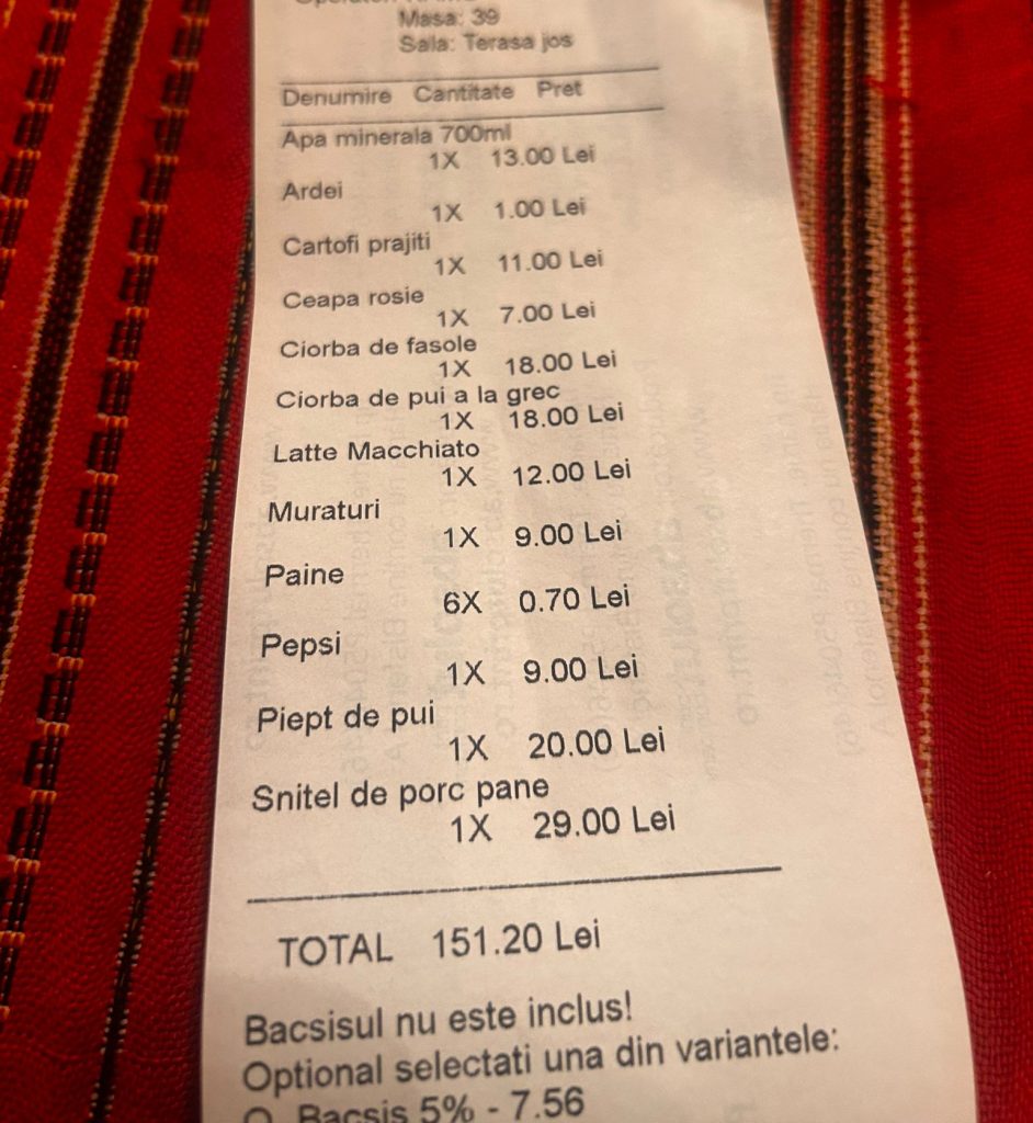 Pe lângă mâncare, am comandat și un Pepsi, o apă minerală și un latte macchiato. Acum, după ce eram satisfăcuți culinar, așteptam nota. Ne gândeam: „Să vezi acum cât costă…”, când colo, pe toate cele degustate, am dat 151,20 lei pentru două persoane. Un preț decent, la cât de bun a fost totul și proaspăt și mult.