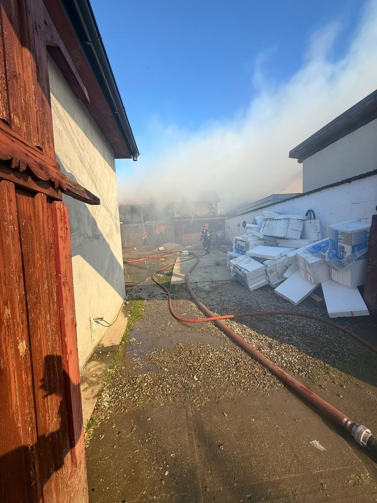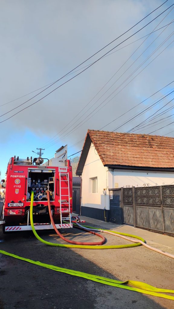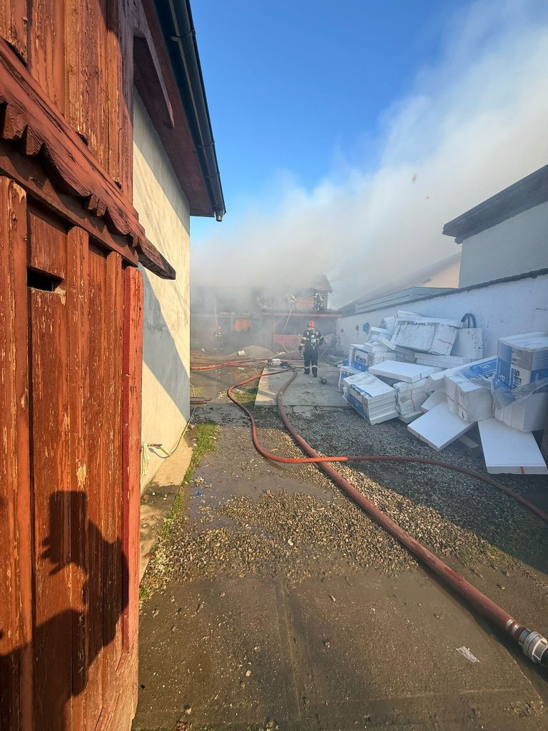 *UPDATE* Pompierii au lichidat incendiul. „Acesta a distrus în totalitate o anexă gospodărească, precum și bunurile depozitate în interiorul acesteia. De asemenea, a fost afectată și fațada casei de locuit din apropierea anexei pe o suprafață de aproximativ 20 de mp. Restul casei a fost salvată, precum și alte două case învecinate.Cauza probabilă de izbucnire a incendiului a fost scurtcircuit electric produs de un cablu electric defect, izolat necorespunzător. Din fericire nu au fost înregistrate victime”, a transmis Sg. maj. Marcu Raluca.