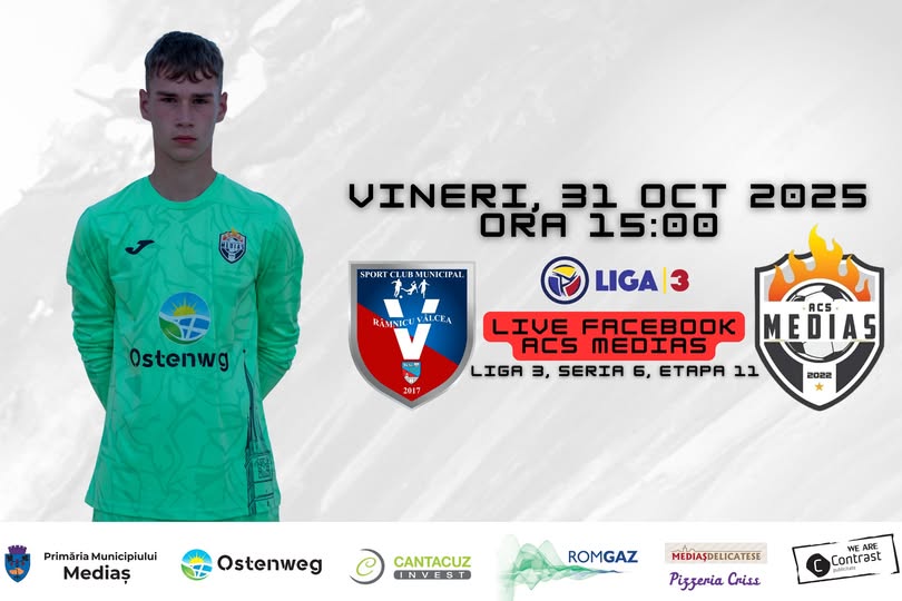 ACS Mediaș 2022 se deplasează la Râmnicu Vâlcea, unde va întâlni formația SCM Râmnicu Vâlcea, într-o partidă programată vineri, 31 octombrie 2025, de la ora 15:00, pe stadionul „1 Mai” Municipal.