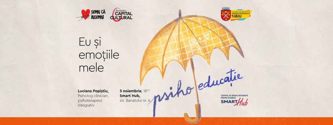 Proiectul „Semn că Însemni. AI psihoeducație”, derulat de Asociația Capital Cultural, continuă în data de 3 noiembrie, cu un nou atelier dedicat tinerilor. Atelierul „Eu și emoțiile mele”, va avea loc la sediul SmartHub Sibiu pe strada Banatului, nr. 6, începând cu ora 18:00, iar participarea este gratuită.