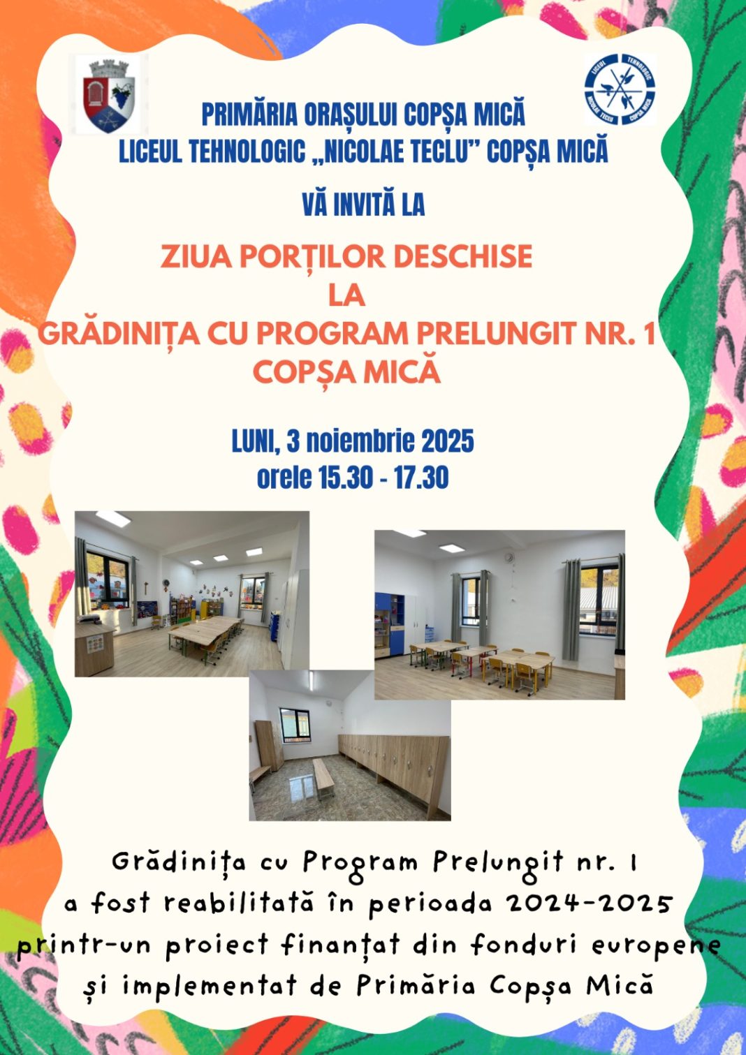 Primăria orașului Copșa Mică, în colaborare cu Liceul Tehnologic „Nicolae Teclu”, organizează în 3 noiembrie, evenimentul „Ziua Porților Deschise” la Grădinița cu Program Prelungit Nr. 1 Copșa Mică.