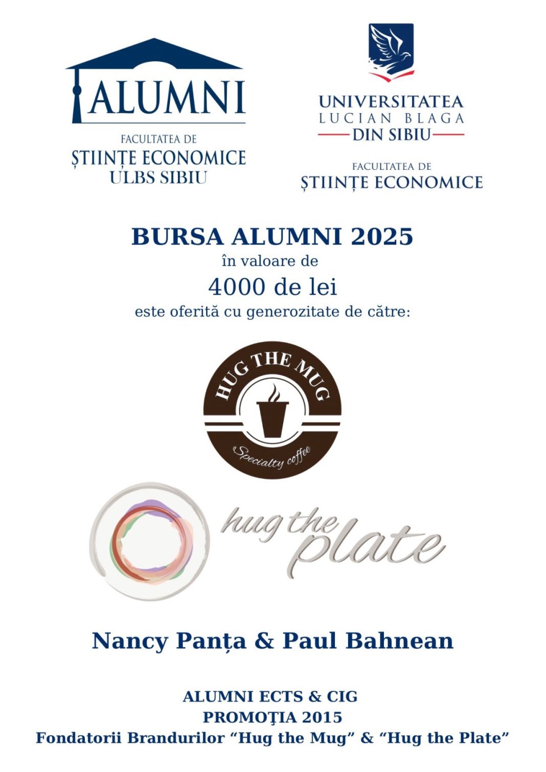 Facultatea de Științe Economice din cadrul Universității „Lucian Blaga” din Sibiu anunță lansarea Bursei Alumni 2025, un proiect care aduce împreună spiritul generațiilor trecute și energia celor de azi. Inițiativa este posibilă datorită Nancy Panța și Paul Bahnean, fondatorii brandurilor sibiene Hug the Mug și Hug the Plate, absolvenți ai promoției 2015 – specializările ECTS și CIG.