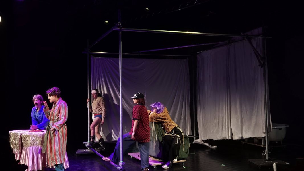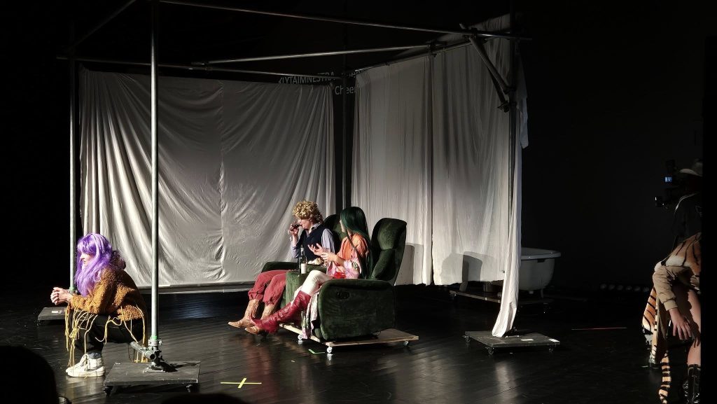 Facultatea de Litere și Arte a găzduit în această seară spectacolul DIONYSUS CITY. Spectacolul în regia lui Titus Georgi combină teatrul clasic cu elemente moderne, punând în scenă povestea de după războiul Troian, întoarcerea lui Agamemnon acasă și moartea lui. Susținut în limba germană, subtitrările au fost atât în română, cât și în engleză.