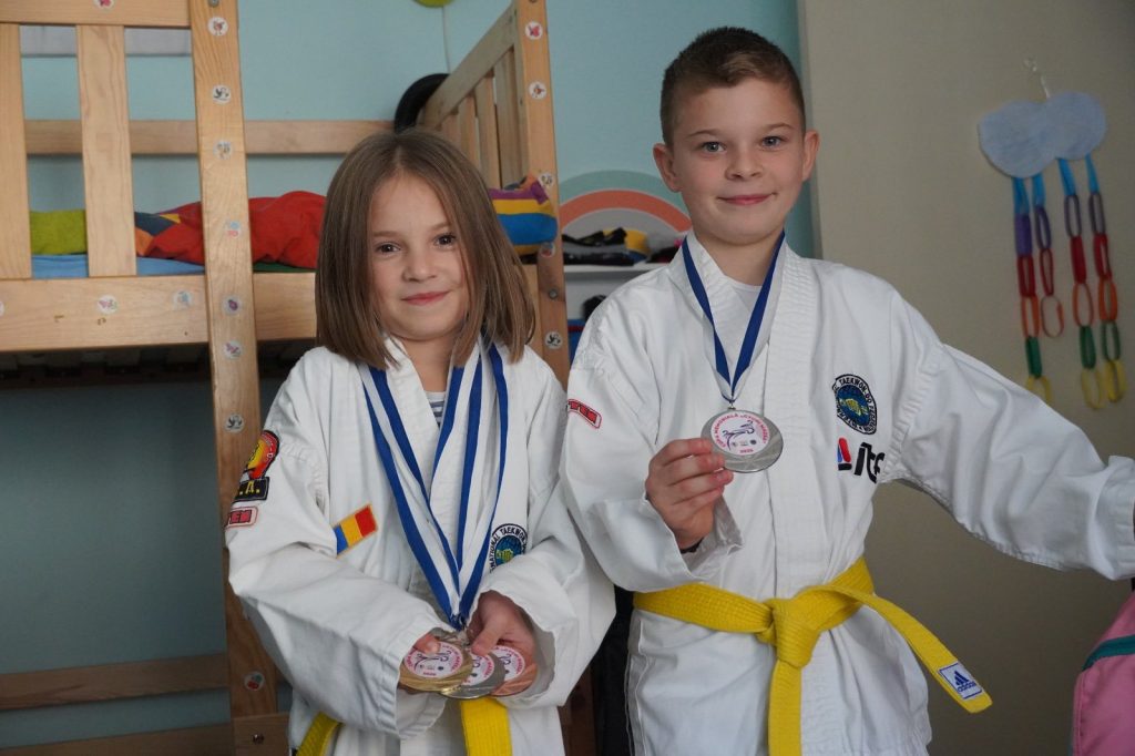 Marian și Ana fac taekewon-do, iar de două ori pe săptămână vin la Sibiu pentru antrenamente. Au deja medalii de aur, argint și bronz, câștigate la probe individuale sau făcând echipă cu colegii de la Clubul „Puma”. „Nu-mi este greu să-i duc la antrenamente, copiii au nevoie de sport, de disciplină și spirit de echipă”, spune preotul Rareș Dușescu, devenit și șofer pe microbuzul familiei.
