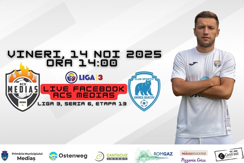 Partida ACS Mediaș – Unirea Bascov se va disputa vineri, 14 noiembrie 2025, de la ora 14:00, pe Stadionul Gaz Metan 2 (Mediaș). Suporterii care nu pot ajunge la meci vor putea urmări confruntarea live pe pagina de Facebook a clubului ACS Mediaș.