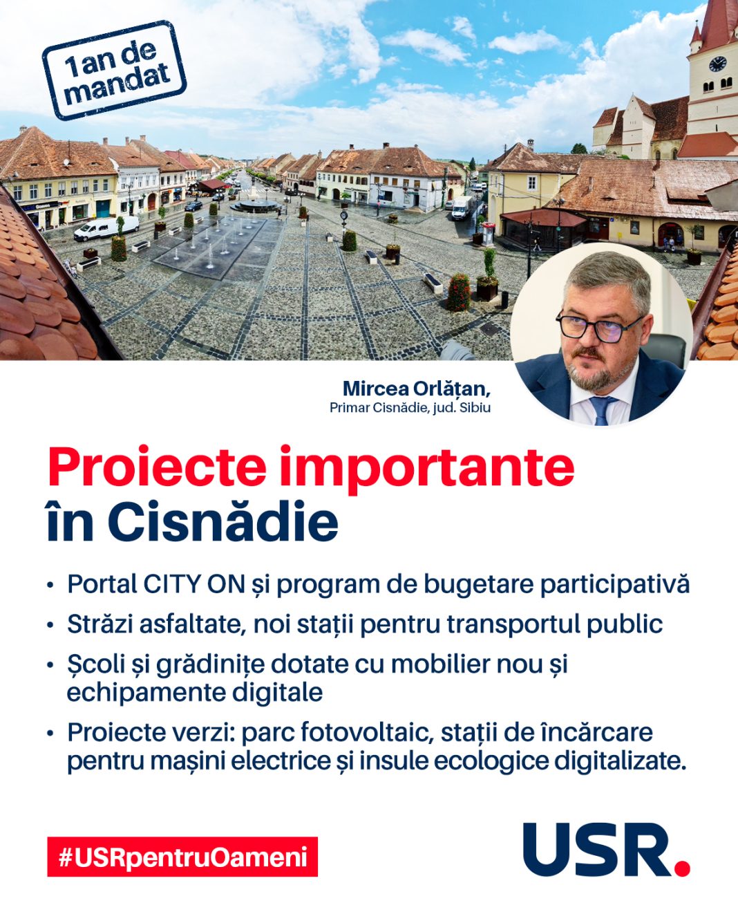 Mesajul publicat de USR la nivel național prezintă Cisnădia drept un exemplu de administrație locală eficientă, cu proiecte concrete și rezultate vizibile, realizate într-un singur an de mandat.