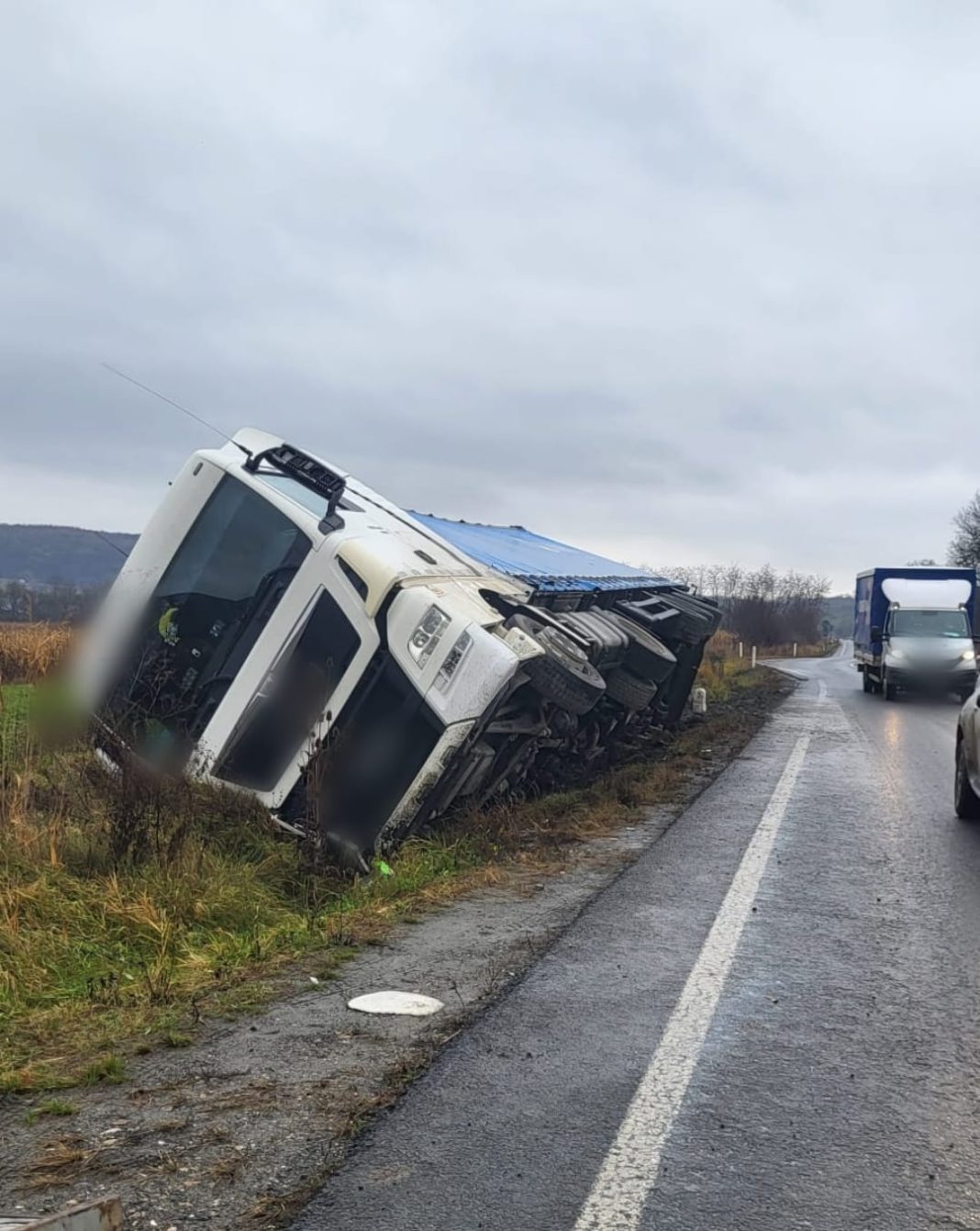Un accident fără victime a avut loc la Slimnic, marți. Un TIR s-a răsturnat în afara părții carosabile.