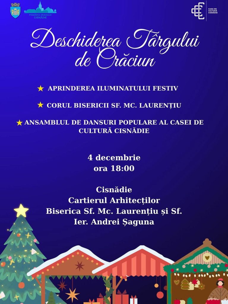 Primăria din Cisnădie a decis și anul acesta ca Târgul de Crăciun și luminițele sclipitoare să fie în ambele locații ale orașului. Inaugurarea târgului de Crăciun a fost confirmată pe data de 3 decembrie la ora 18:00 în Piața Revoluției și va fi însoțită de momentele artistice susținute de elevii unităților de învățământ din Cisnădie, ansamblul de dansuri populare al Casei de Cultură și concert susținut de trupa Joyband.