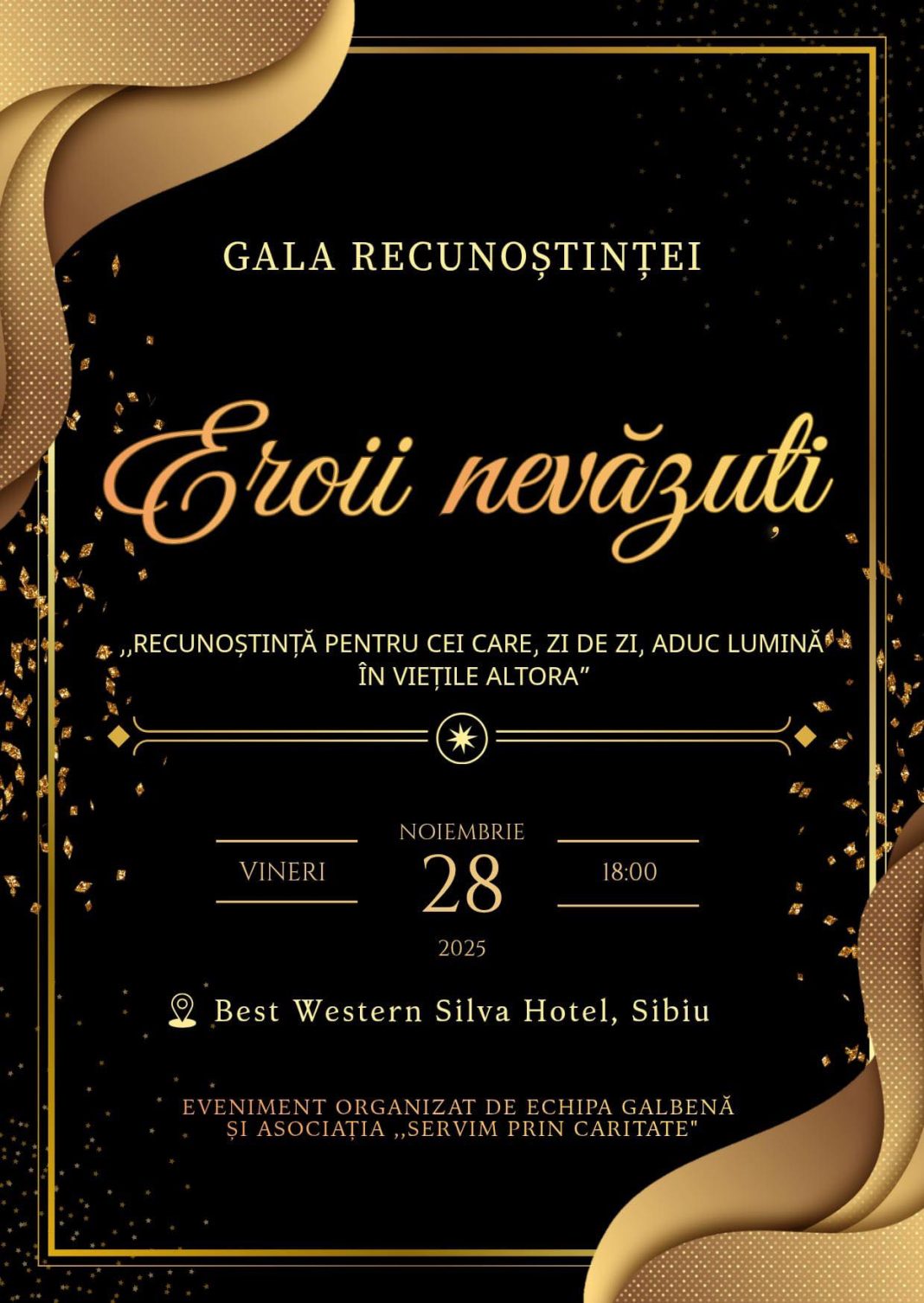 Sibienii sunt invitați în data de 28 noiembrie de la ora 18:00 la o nouă ediție a galei „Eroii Nevăzuți”. Evenimentul de recunoștință va avea loc la Best Western Silva Hotel din Sibiu și este organizat de Echipa Galbenă Sibiu și de Asociația Servim prin Caritate.