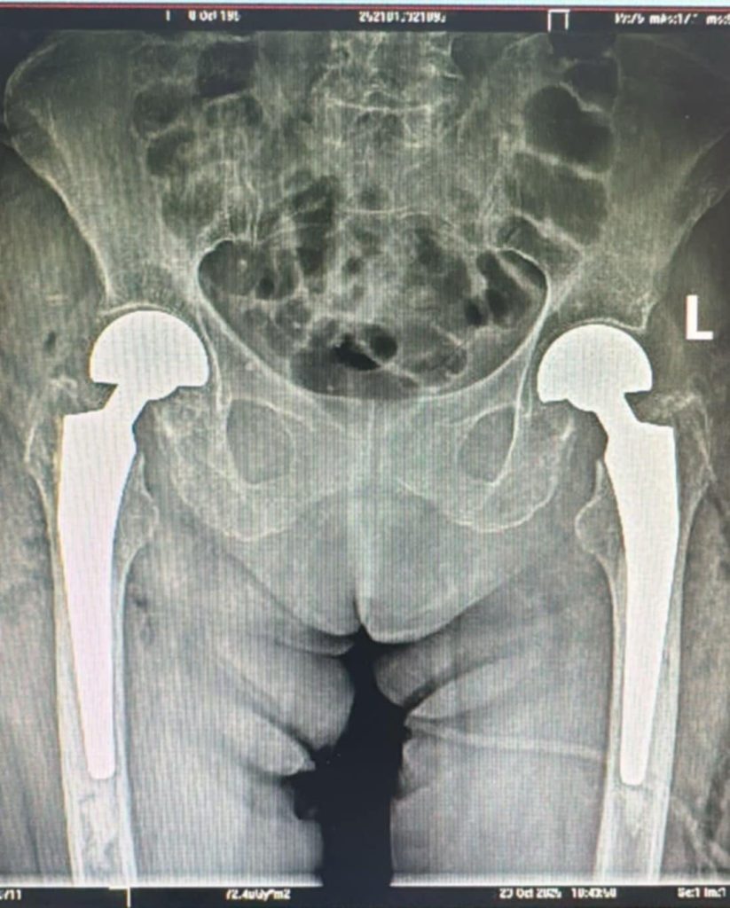 Echipa medicală a decis efectuarea unei artroplastii parțiale de șold bilateral cu proteze bipolare cimentate, realizată concomitent pe ambele șolduri – o intervenție cu grad înalt de dificultate și intensitate operatorie.