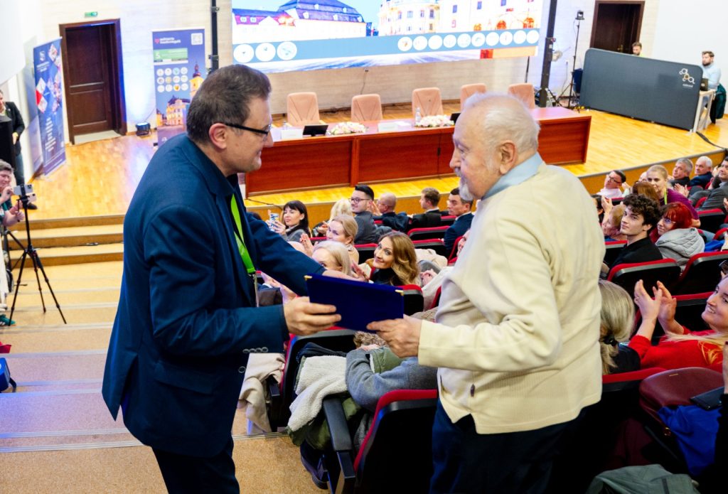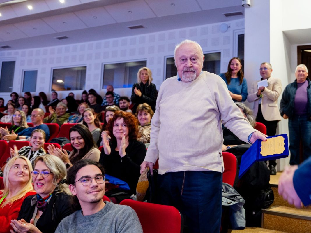 În aplauzele întregii săli, Acad. Prof. Univ. Dr. Mircea Lăzărescu a primit placheta simbolică, iar participanții s-au ridicat în picioare pentru a-l saluta.