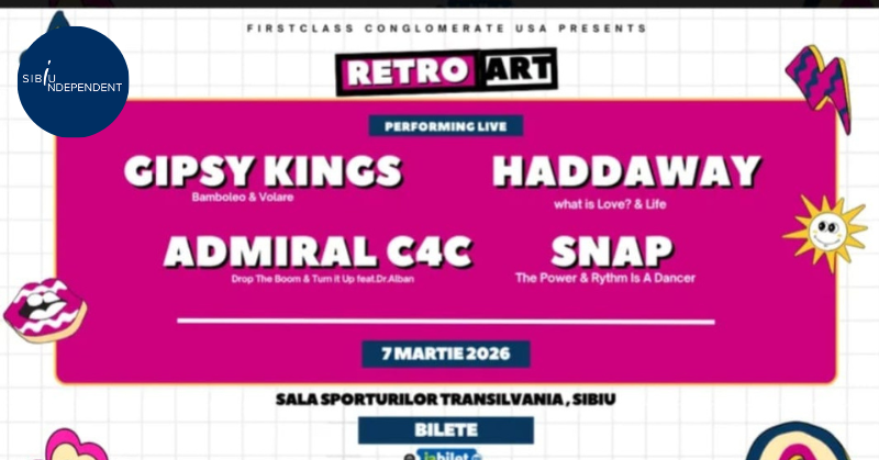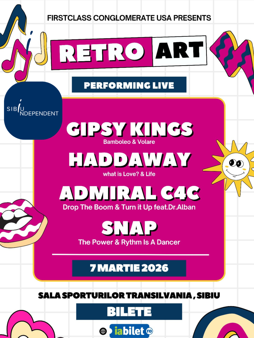 Unul dintre cele mai așteptate evenimente muzicale ale anului revine în forță. Retro Art va transforma Sala Sporturilor din Sibiu într-o adevărată scenă internațională, aducând artiști legendari care au făcut istorie: Haddaway, Gipsy Kings, SNAP! și Admiral C4C. Evenimentul are loc în data de 7 martie și promite o experiență live, fără DJ, fără playback, doar muzică autentică și energie pură.