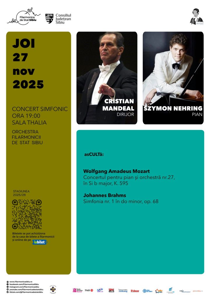 Solistul invitat este pianistul polonez Szymon Nehring, unul dintre cei mai apreciați tineri pianiști ai momentului, câștigător al Concursului Internațional „Arthur Rubinstein” și finalist al prestigiosului Concurs „Chopin”. Artistul va interpreta Concertul pentru pian nr. 27 în Si bemol major, K. 595, ultima lucrare concertantă a lui Mozart, caracterizată prin rafinament și echilibru expresiv.