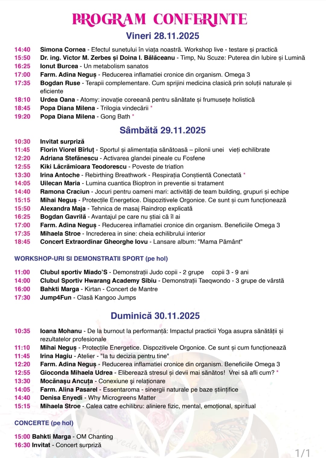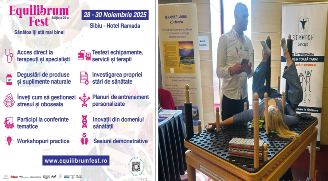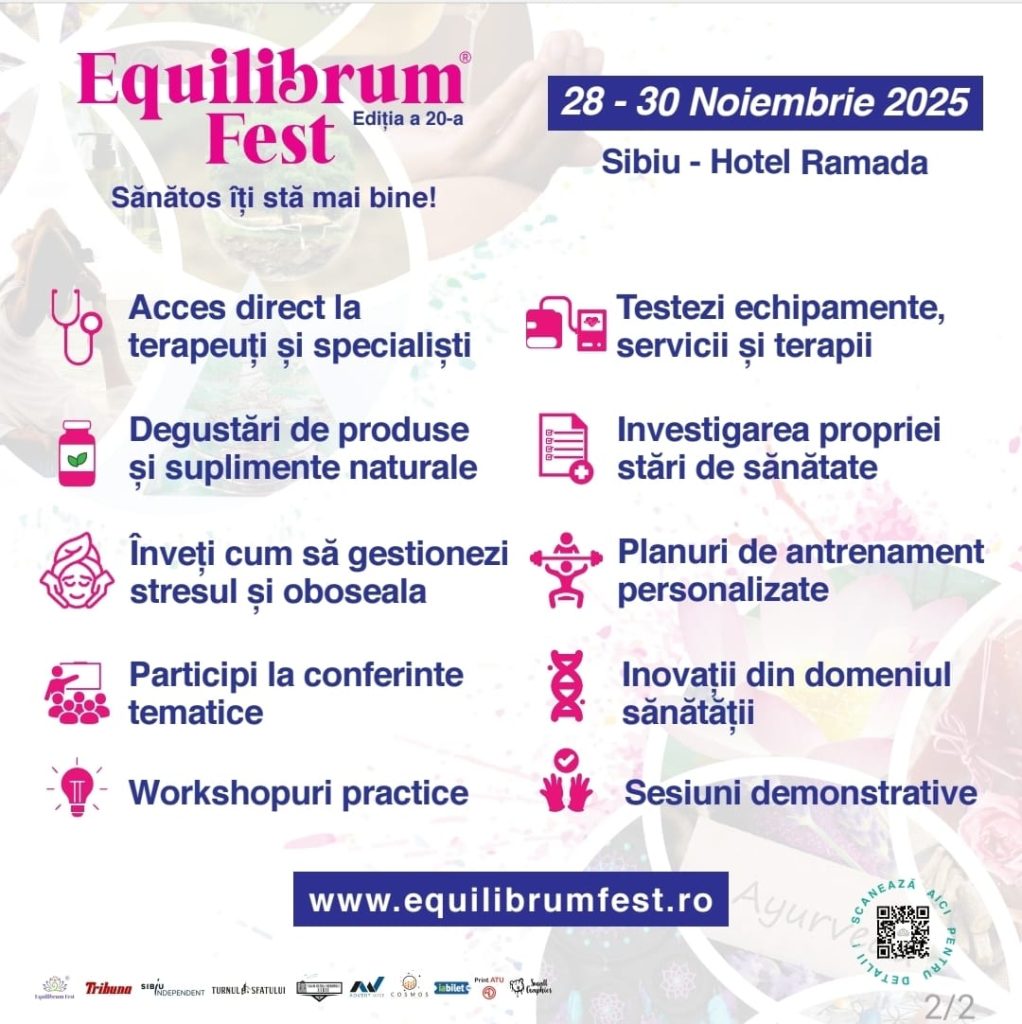 După ce a parcurs șapte orașe din țară, Equilibrum Fest, cel mai complex târg-festival de stil de viață sănătos din România, revine pentru a șasea oară la Sibiu, în perioada 28-30 noiembrie. Ediția aniversară, a 20-a, se desfășoară la Hotel Ramada și promite trei zile pline de conferințe, workshopuri, demonstrații sportive și muzică terapeutică.