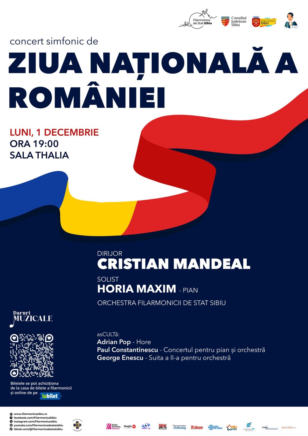 Tradiția Filarmonicii de Stat Sibiu de a dedica 1 Decembrie muzicii românești continuă și în acest an. Programul serii include lucrarea „Hore” de compozitorul Adrian Pop, deja recunoscută internațional, precum și celebrul Concert pentru pian și orchestră de Paul Constantinescu, avându-l ca solist pe apreciatul pianist Horia Maxim.
